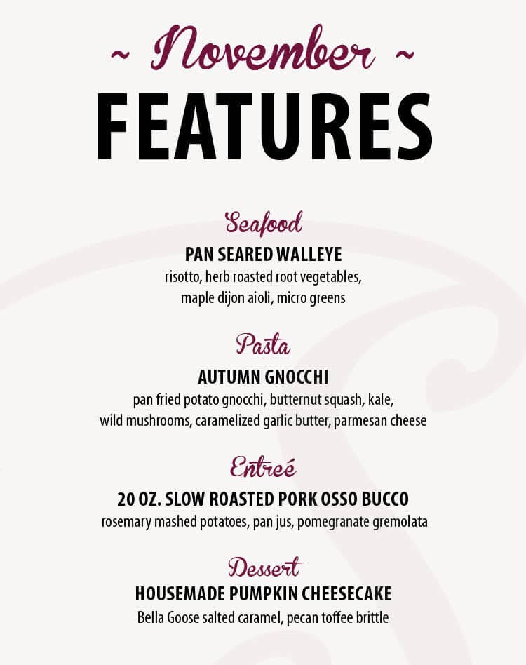 Our executive chef prepares exclusive monthly dishes, including soup, pasta, entrees, and more!